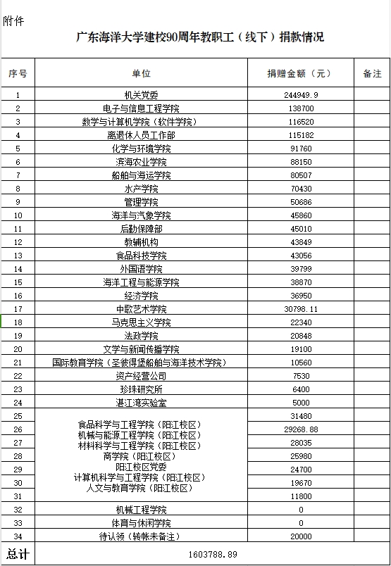 根据《关于做好学校90周年华诞教职员工捐赠工作的通知》要求,我校全体师生积极响应,踊跃捐款。全校共筹捐款人民币1603788.89元。